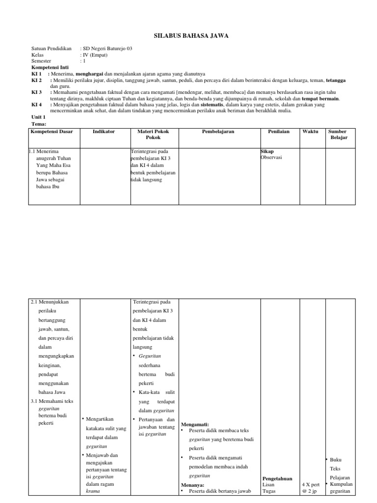 Silabus Bahasa Jawa Kelas 4 Semester 2 / Rpp Dan Silabus Bahasa Jawa Sd Kelas 1 S D 6 Kurikulum 2013 Ktsp Info Pendidikan Com. Jun 07, 2020 · pemetaan kompetensi dasar kelas rendah atau dalam hal ini kelas 1, 2 dan 3 semester 1 terdiri atas 4 tema. Jun 09, 2017 · 2) komunikasi interaktif, 3) komunikasi ekspresif 4) komunikasi real time 5) komunikasi ritual 6) komunikasi instrumental yang termasuk fungsi komunikasi ialah …. Setiap tema memuat 4 subtema dan beberapa muatan pelajaran yang bersifat tematik. 2, 4, 5 jawaban : Diantara muatan pelajaran yang wajib dalam tematik kelas rendah yaitu ppkn, bahasa indonesia, matematika, sdbp dan pjok.